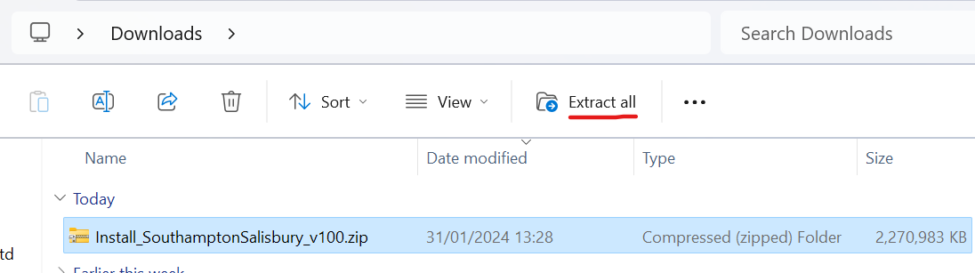 In Windows 10/11 you should be able to do this without installing any additional applications by selecting the .zip file you've downloaded and clicking the "Extract all" option from the Explorer toolbar: